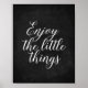 "Enjoy the little things", inspirational quote art on chalkboard background.