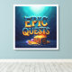 A vibrant watercolor painting featuring the phrase "Epic Quests" in a bold, artistic script. The letters are adorned with shimmering gold accents and surrounded by a treasure chest overflowing with jewels and gold coins. The background is a deep blue, reminiscent of the ocean depths, adding to the sense of adventure and treasure hunting.