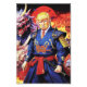This captivating artwork depicts President Trump as a powerful samurai warrior standing confidently amidst a fiery backdrop. He is dressed in traditional blue and gold samurai armour, holds a katana and is surrounded by fierce, mythical demons. The intense red sky and flames add to the dramatic and fantastical atmosphere, making this image a striking representation of a heroic battle scene.