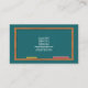 A business card for a math teacher or geometry tutor with a green chalkboard in a wooden frame, a compas and equations of Schrödinger and Newton's law of universal gravitation. Icons are used to display phone and e-mail information. Full contact details are available on the back.