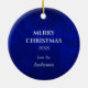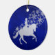 This elegant Christmas ornament features a silver silhouette equestrian in front of a spray of silver snowflakes. The image is placed on a blue gradient background that seems to almost glow. The back of the ornament has the same blue background with text fields for you to customise.