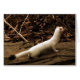 This note card features the stoat (Mustela erminea), also known as the ermine or short-tailed weasel, a species of Mustelid native to Eurasia and North America. His winter coat is pure white with a black tip at the tail. In summer, the fur molts to brown. He is a fierce hunter, feeding mainly on small rodents but quite capable of catching prey much larger. Here he is briefly pausing on a fallen log before continuing his hunting activities.