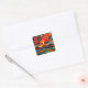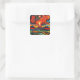 A vivid and colourful depiction of a volcanic eruption dominates the scene with a swirling starlit sky and stylized lava flows. In the foreground, a sinuous river meanders through a landscape dotted with rounded trees and rolling hills, while a dynamic sky swirls above in bold patterns
