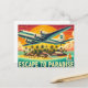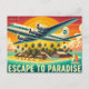 Here’s an enhanced vintage travel postcard featuring a sleek aeroplane flying over a tropical island with golden beaches, palm trees, and turquoise waters, now with more island details. ✈️🏝️🌅 The scene includes a luxury resort with cabanas, sailboats near the beach, and colourful coral reefs visible through the clear water. The bold 1950s-style typography reads "Escape to Paradise.