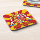 The national coat of arms of Espana (Spain), plus the country name, are designed in a perspective form. These images are in the centre of a starburst background, which is made with the colours of the Spanish flag.