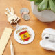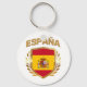 The national flag of Spain is infused into a faux gold shield shape which is resting on faux gold laurel leaves.