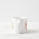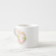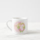 Pretty flowers and butter flies espresso cup for Valentines or Mother's Day. A heart shape made up of gold and pink flowers on a background of pink butterflies and scrolling flourishes.