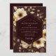 Experience a dramatic and romantic atmosphere with this moody floral design. It features luminous ivory and gold anemones and delicate roses, artistically rendered against a deep espresso brown background. The chiaroscuro effect creates a timeless, baroque elegance perfect for a sophisticated union.