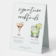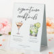 This chic signature cocktails list features simple black tyopgraphy above 2 drinks and their ingredients for your wedding bar. An espresso martini and gin and tonic drawing add a cool flair to your bar table tent sign. Complete with the couple's names and date for their reception.