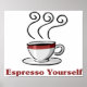 A steaming cup of coffee with Espresso Yourself under it. You enjoy coffee, why not let the world know it.