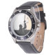 This exquisite men’s watch features a striking silhouette of a fisherman reeling in his catch, elegantly etched in black against a sunlit steel backdrop. The design evokes the serene beauty of a sunny evening by the water, making it an ideal accessory for fishing enthusiasts.