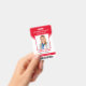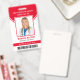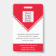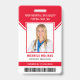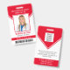 This personalised red ID badge includes an employee photo, name, title, hospital/company name, location, employee ID number, and barcode. Background features red and white. Back of badge features your logo and additional custom text fields for return information or other details. Perfect for medical or corporate facilities who need security identification.