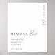 This mimosa bar sign features a modern calligraphy script heading and minimalist design. The script text headings are images that cannot be edited. The heading image can be resized to fit any poster size. All of the other text is fully editable. For more advanced customisation of this design, simply select the "Customise It" button above.