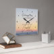 Wall clock with inspirational quote scripture depicts a nature photograph with a beautiful blue and orange sunset over the mountains. It features Bible Verse Esther 4:14, "Perhaps this is the moment for which you have been created."