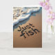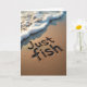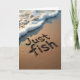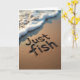 This card shows a close-up beach scene where the words “Just Fish” sit low across the centre, carved into moist, golden sand with dark, wet grooves that make the letters stand out. The view is tight and softly blurred in the distance, keeping your attention on the deep indentations and the tiny grains that sparkle like little beads. Along the upper edge, a pale, foamy wave pulls back in a gentle curve, like it’s teasing the message and letting it linger a moment longer. Warm light, like early morning or late evening, slips into the carved lines and creates small shadows that give the words a raised, touchable look. The simple phrase feels like a shared inside joke between two people—one who loves the shore and one who’s ready for a relaxed day together 🚗. The text is formed by the sand itself, with no ink, and it reads in a casual, slightly slanted line that looks naturally pressed into place. At the very top, the waterline fades into a soft white blur while the damp sand near the letters stays richly golden and glossy 🍺.