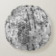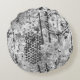 This throw pillow features an eclectic abstract that includes circles of zebra stripes. The colours range from grey (or grey) to charcoal to black.