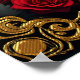 Eternal love in the shadows of darkness, in Gothic style. The focal point is a majestic Gothic archway decorated with delicate gold details and shining against a deep red background. The two elegant columns flanking the archway add a sublime touch to the design and emphasise the opulent design. The heart dangling gently from the archway draws the eye and is framed by a dripping blood effect,