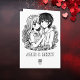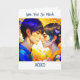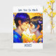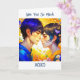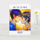 A Valentine's Day card with an anime woman and man nose to nose about to kiss in love. Blue and gold accents with butterflies and flowers.