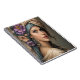 A captivating portrait of a woman with striking blue eyes, adorned with a lush floral headdress and draped in a richly patterned turban. Her gaze is serene, complemented by delicate flower-laden earrings and a soft, flowing garment, evoking a sense of romantic bohemian beauty.