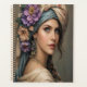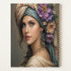 A captivating portrait of a woman with striking blue eyes, adorned with a lush floral headdress and draped in a richly patterned turban. Her gaze is serene, complemented by delicate flower-laden earrings and a soft, flowing garment, evoking a sense of romantic bohemian beauty.