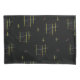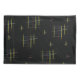 Yellow, burgundy and white squiggles and lines in a repeat pattern on a black background suggests a sense of movement and energy.