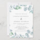 A pretty wedding invitation featuring delicate dusty blue/grey blue and green watercolor botanical eucalyptus leaves on a white background. The reverse is in solid dusty blue. This invitation works beautifully for any season, but would be especially great for a winter wedding.