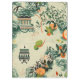 The picture shows a stylish, minimalist pattern, combining lush green leaves and juicy orange fruits, which rest on a soft, undulating background. Two elegant temple structures harmoniously emerge from nature, radiate peace and spiritual depth. The palette of green, orange and cream colors gives freshness and serenity, inviting to contemplation and inner peace.