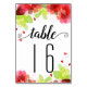 Ethereal red flowers calligraphy flloral wedding table number card. It includes a pretty bouquet of red and pink flowers and green leaves. The word "table" is written in a cursive script handwritten calligraphy style font.
