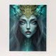 An enchanting digital portrait of a silver-haired goddess with striking blue eyes and delicate facial markings. Her brow is graced by an intricate golden filigree tiara featuring glowing turquoise accents. This serene and highly detailed fantasy artwork offers a sophisticated and calming puzzle-building experience for collectors of mystical art.