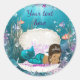 Mermaid baby shower stickers with adorable ethnic mermaid wearing a tiara and pearls on a pretty teal blue and purple under the sea background. You can add text to personalise these cute ethnic African American mermaid baby shower stickers.