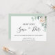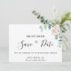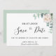 A modern Save the Date card for a wedding. A chic white background decorated with green watercolored eucalyptus greenery, leaves and sprigs and a watercolored white peony, flower floral. Personalise and add your names, the date and place of the venue. Black coloured letters. The text: Save the Date is written with a large trendy hand lettered style script.