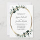 Eucalyptus All in One QR Code RSVP Gold Metallic Wedding Invitation... Our "All in One" luxe botanical wedding invitation features a gold metallic oval frame embellished with emerald-hued eucalyptus leaves bordering your personalised wedding invitation text. The back of the invitation also displays your wedding website QR code as well as the website's URL itself allowing your invitees to easily RSVP online and view all of the details normally sent in a wedding packet. This modern style wedding invitation was designed to be both elegant and budget conscious... not to mention time-saving. All example text can be easily revised with your own information on the personalisation template.