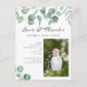 Elegant eucalyptus baby photo announcement card with text, "Love and thanks"