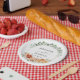 The design features a lovely combination of eucalyptus leaves and delicate peonies, with peach, orange and yellow tones blending together on a crisp white background. Both practical and elegant, these plates will add charm to any event.