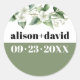 Eucalyptus branch and flowers, typography wedding classic round sticker