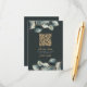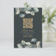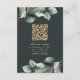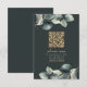 A modern wedding RSVP card featuring a deep charcoal green background with elegant watercolor eucalyptus leaves in muted green and grey tones. A gold QR code is centred for easy online responses, with “please rsvp” in graceful script above a clear deadline and instructions. The couple’s names are highlighted in gold serif type, creating a sophisticated, nature-inspired look. This card blends convenience and style, making it perfect for contemporary weddings with botanical or minimalist themes.