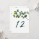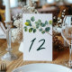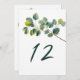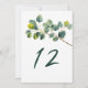 Eucalyptus branch wedding table number. Add a touch of serene elegance to your wedding reception with this beautifully designed table number card, featuring a graceful watercolor style illustration of a eucalyptus branch and lush green leaves. The botanical artwork evokes the fresh charm of a tranquil garden, with pretty, overlapping foliage capturing the natural beauty of greenery in soft, inviting tones.