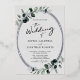 Eucalyptus Calligraphy Pastel Grey All in One Wedding Real Silver Foil Invitation... The front of our luxe botanical wedding invitation features a real silver foil oval frame embellished with emerald-hued and grey eucalyptus leaves on a soft pastel grey background. The light grey back of the invitation contains all of the details you would typically see on separate cards in the wedding packet. This modern style wedding invitation was designed to be both elegant and budget conscious... not to mention time-saving. All example text (aside from the graphic calligraphy elements) can be easily revised with your own information on the personalisation template.