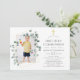 Trendy watercolor eucalyptus silver dollar first communion invitation with gold geometric frame. A portrait shaped photo is recommended.
