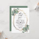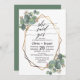 This is a beautiful wedding engagement party invitation featuring eucalyptus and gold geometric frame design.