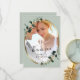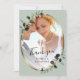 Eucalyptus Gold Elegant Script Sage Photo Wedding Thank You Card... Our elegant eucalyptus photo wedding thank you card features a gold metallic oval frame embellished with emerald-hued eucalyptus leaves bordering a photo of the bride and groom on a light sage green background. Your photo will be placed on a layer underneath a white transparency to "fade" the colours at the bottom somewhat so the "Thank you" text and bride and groom names overlaid on top are readable. The sage back of the card displays wording you can keep or revise for your personal thank you message. All example text can be easily revised with your own information on the personalisation template. Part of a wedding suite with coordinating accessories in the same eucalyptus gold oval theme.