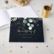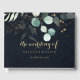 This eucalyptus gold floral calligraphy wedding guest book is perfect for a rustic wedding. This artistic design features hand-drawn gold floral and watercolor eucalyptus green foliage in a dark blue background, inspiring natural beauty.