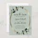 Eucalyptus Gold Metallic Sage Wedding Save the Date Postcard... Our sage green luxe botanical Save the Date postcard features a gold metallic oval frame embellished with emerald-hued eucalyptus leaves creating a natural looking border for the announcement text within. The back of the card contains your return address, wedding website information, and a QR code graphic template you can replace with your own code graphic. All example text on both sides of the card can be easily revised with your own details on the personalisation template.