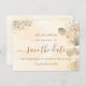 A golden watercolored background decorated with golden eucalyptus foliage and faux gold glitter dust. Personalise and add the date, place and your names. Golden coloured letters. The text: Save the Date is written with a large trendy hand lettered style script.