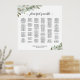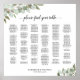 This alphabetical wedding seating chart has space for up to 250 names. It features a rustic watercolor design with eucalyptus leaves, greenery, and garden foliage in shades of mint, moss, and sage green. The elegant script calligraphy title reads: Please find your table, and the names of the couple and wedding date appear at the bottom. Wonderful way to help your guests find their seats while adding elegance and style to your reception.