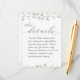 A simple eucalyptus greenery border along the top and bottom highlight this wedding details sheet. A lively swash calligraphy in silver is used for, "the details," title with a script cursive font for your text.