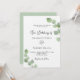 A white background decorated with eucalyptus greenery sprigs. Personalize and your name and ceremony details. Black colored letters.