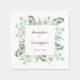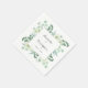 These beautiful wedding napkins features a lush border of greenery including eucalyptse and light coloured flowers. The design is accented with handwritten style text for the names of the bride and groom and their wedding date.