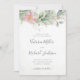 Beautiful Save the date card featuring pink floral watercolor eucalyptus and gold leaves with modern handwritten script.