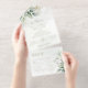 This exquisite all-in-one wedding invitation features a sophisticated design blending lush watercolor eucalyptus greenery with elegant real gold foil accents. The natural botanical elements, subtly enhanced by shimmering golden flecks, create a fresh and romantic aesthetic. Personalised details are beautifully presented in a mix of classic and modern typography, with key information highlighted in genuine gold foil for an added touch of luxury. This design perfectly captures a serene yet celebratory mood, ideal for a chic and memorable wedding event.